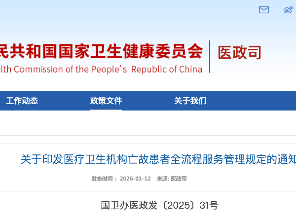 12日,国家卫健委等六部门发布医疗卫生机构亡故患者全流程服务管理规定。该规定明确了死亡证明签发主体、死亡证明签发流程、遗体暂存区设置、亡故患者遗体转运管理等内容,进一步加强医疗卫生机构亡故患者服务管理