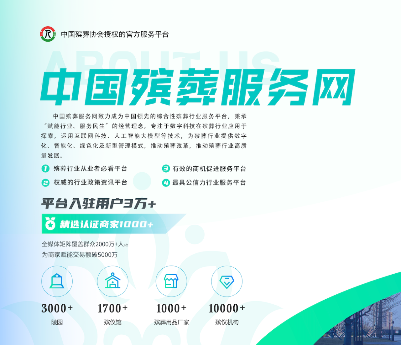 中国殡葬服务网致力成为中国领先的综合性殡葬行业服务平台,秉承“赋能行业、服务民生”的经营理念,专注于数字科技在殡葬行业应用于探索,运用互联网科技、人工智能大模型等技术,为殡葬行业提供数字化、智能化、绿色化及新型管理模式,推动殡葬改革,推动殡葬行业高质量发展。