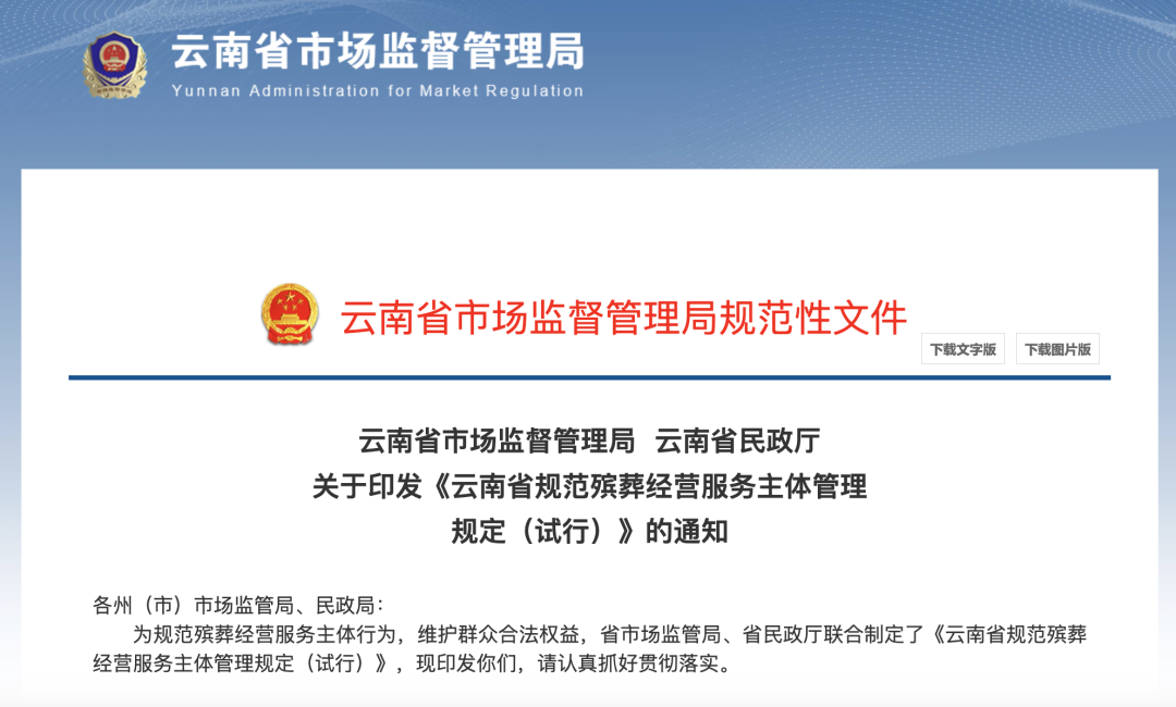 近日,云南省市场监督管理局会同云南省民政厅印发了《云南省规范殡葬经营服务主体管理规定(试行)》(以下简称《规定》),现将有关政策解读如下: