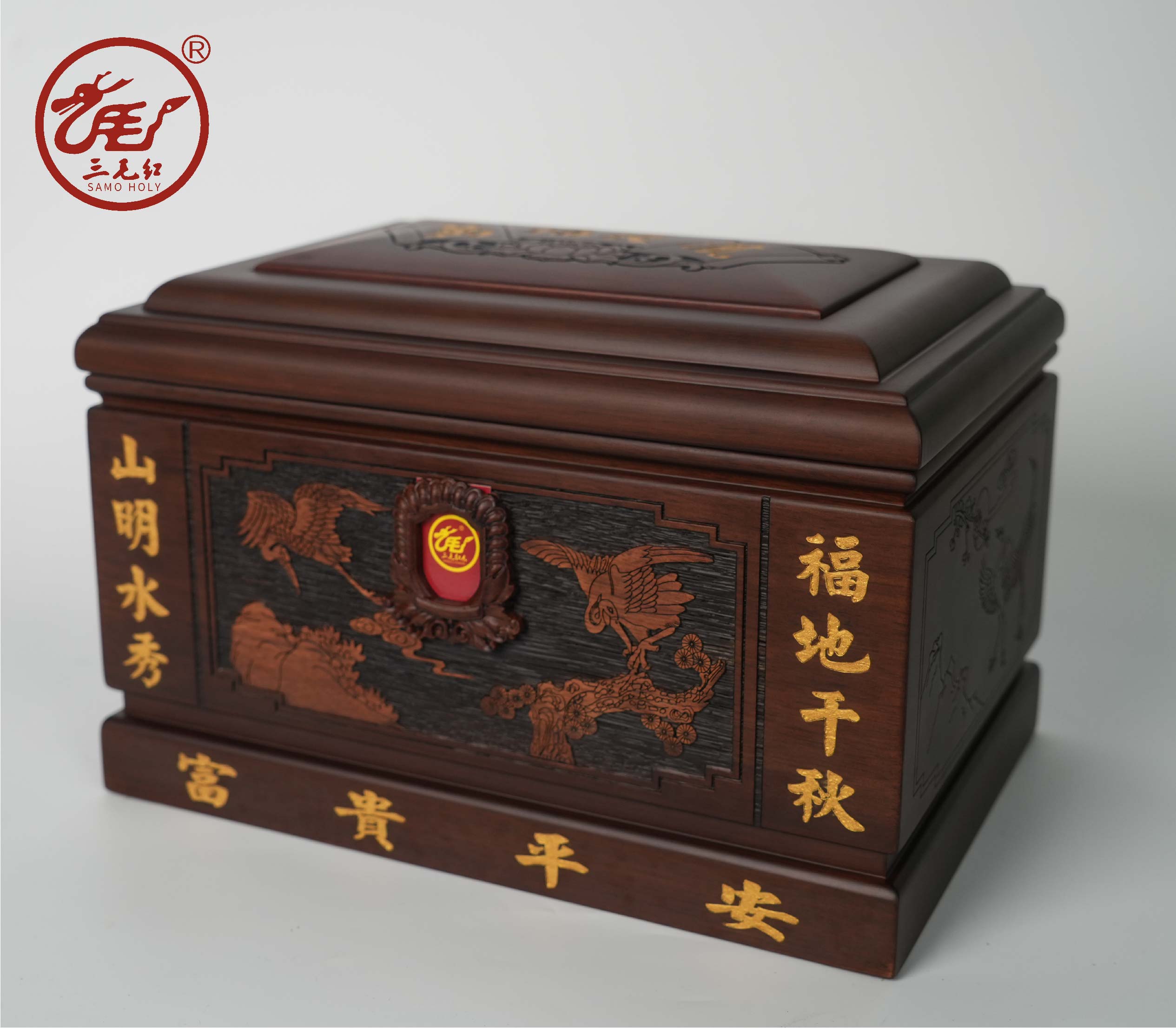 寿盒造型端庄大气,采用镂空填金技术,使整体感觉富贵无双,盒顶莲花搭配盒身松鹤图,构成一幅福地景象,寓意先人如住福地,护佑子孙后代万福长流、富贵平安。