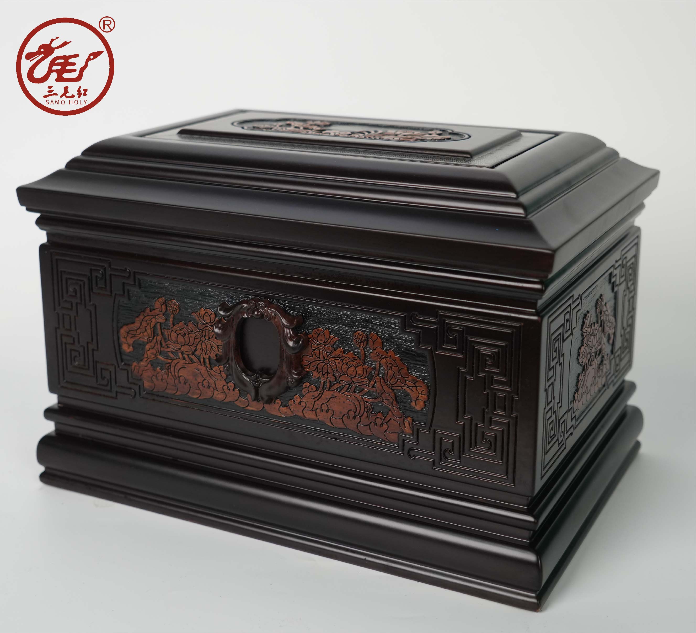 寿盒雕刻莲花,莲花就是荷花,“荷”与“和”同音,**和谐,祥和。内雕“七星引路,福泽后人”,并配以“七星引路钱”,庇佑后人代代安好,平安富贵!