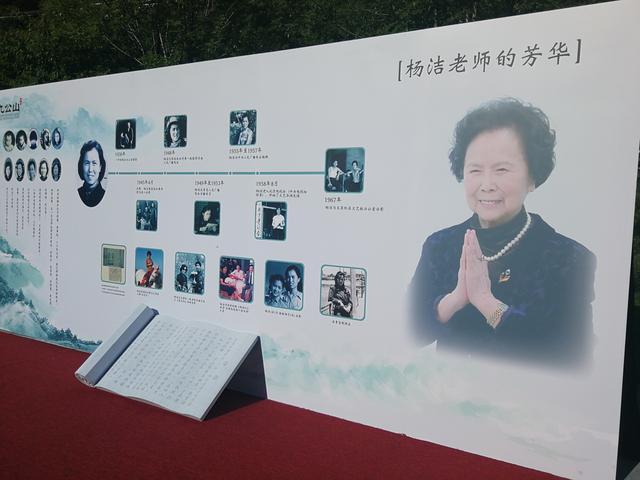 亲友及宾客还未到来时,杨洁导演的追思会背景墙静静地立在九公山的蓝天白云微风、绿树红花阳光的怀抱中,似乎也在等着见那许久未见的人。墙上印有杨洁导演生前事迹,及作出的伟大功绩。