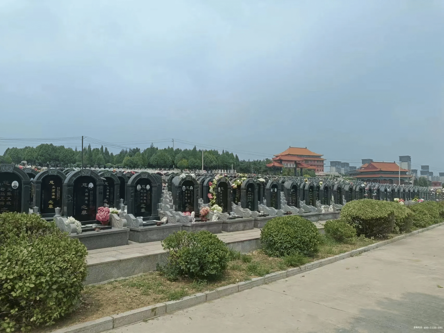 园区占地百余亩,规划遵循 “园林化、艺术化、人文化” 理念,小桥流水、亭台楼阁与苍松翠柏相映成趣,四季常青、步移景异。墓区布局规整有序,碑型设计兼具传统庄重与现代简约,既有经典立碑,也有艺术雕塑墓、节地生态葬。