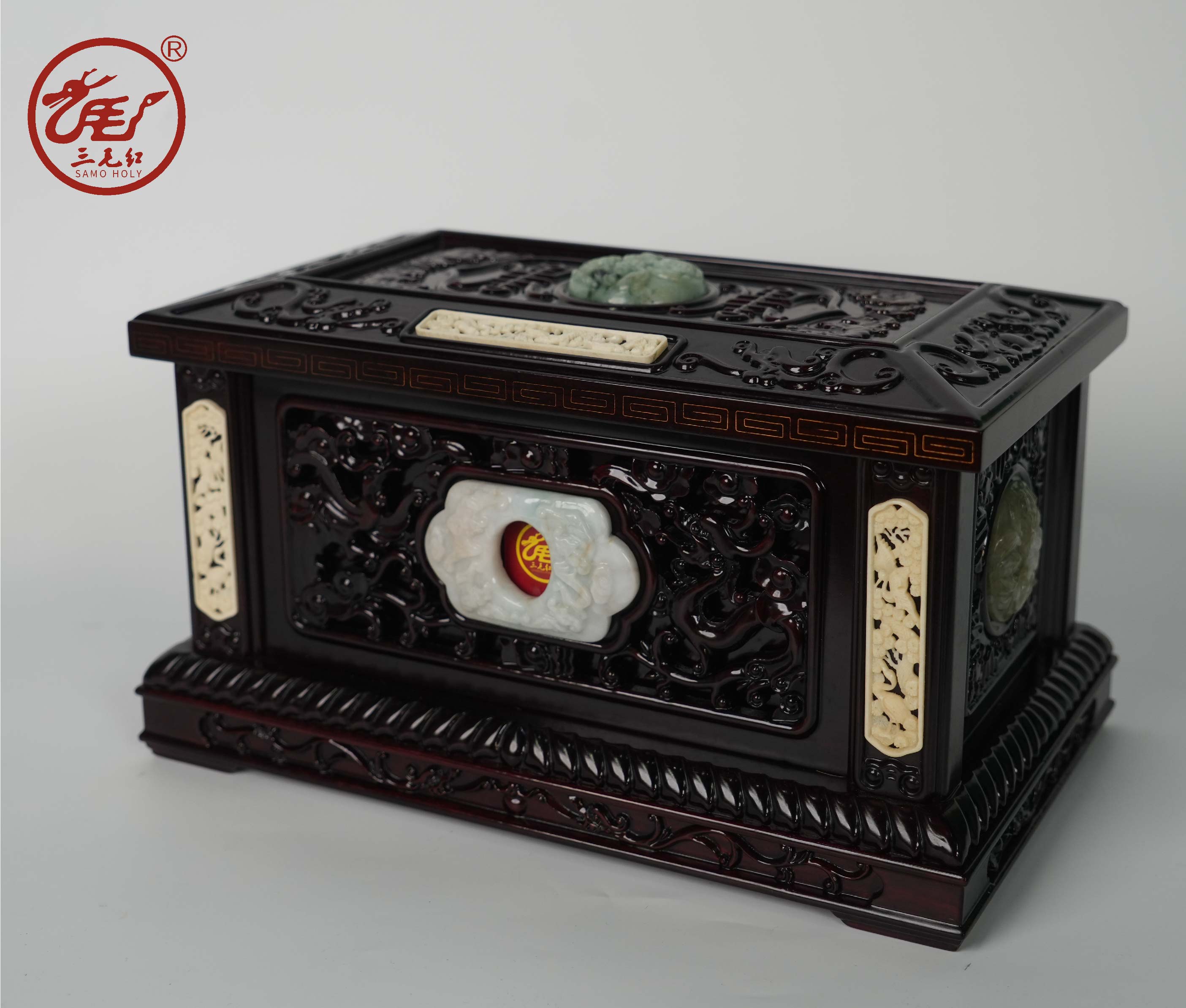 产品造型简洁,雕工精美,盒身配以高级翠玉、稀有骨片,整体气质奢华。蝙蝠纹***传统寓意纹样。蝠和福同音,借喻福气和幸福之意。庇佑子孙后人富贵荣华、洪福齐天。