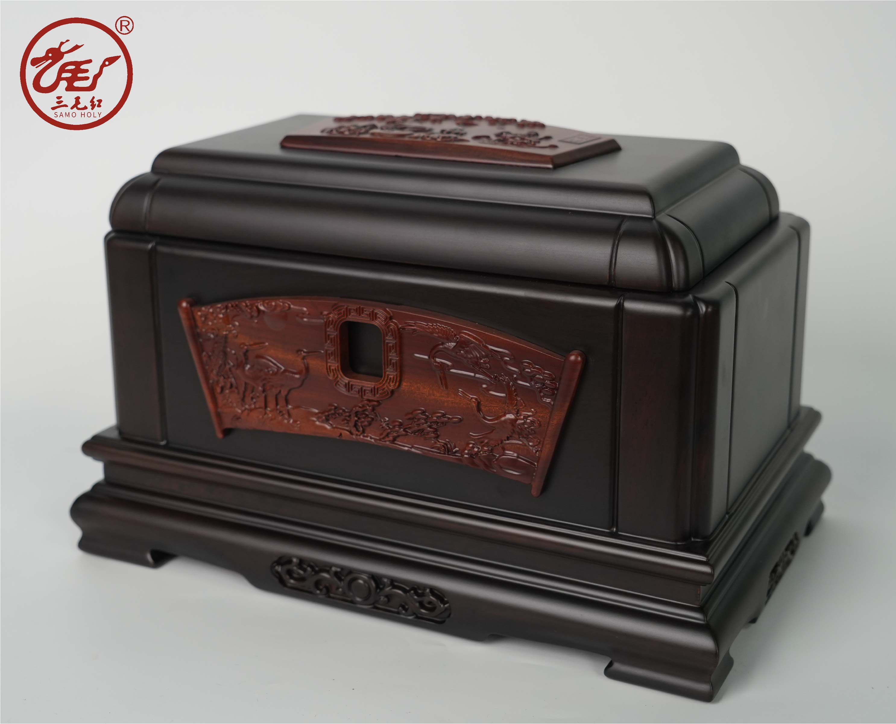 寿盒以松鹤图为设计雕刻主题,松鹤梅寓意着高洁长寿优雅。有鹤仙千年寿,松龄**春,将松树和仙鹤一同入画,取其延年长寿的吉祥寓意。庇佑子孙后代福泽延绵,吉祥如意!